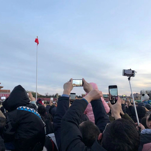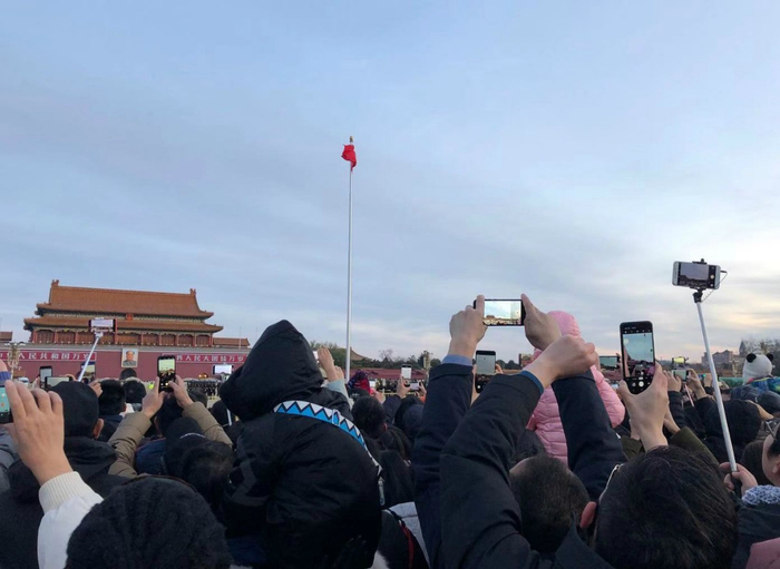 6点半,晨光熹微中整座城市渐渐醒来。此时到达的人群,位置太过靠后,已经不可能看见仪仗队了。那么便索性放弃一定要“完美记录”的执念,三五成群摆造型拍照、兴高采烈地谈天说地。来过、感受过,便已心满意足。