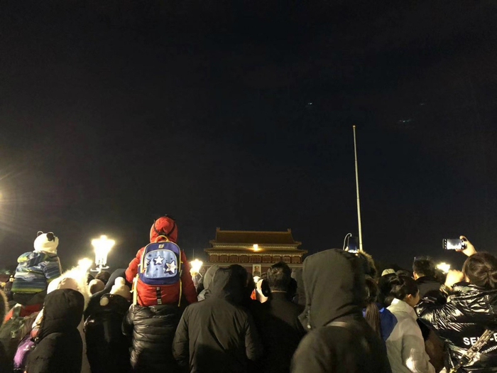 不到晚上9点,宾馆里便涌动起“观旗倒计时”的氛围。站在走廊,很容易透过不太隔音的墙壁听到房间里的洗漱声,孩子的喧闹声,以及父母吆喝着催他们早点睡。当然,最多的还是操着各种方言的电话和视频。在一句句“行,给你发”、“尽量往前站”、“我多拍点儿”的快乐应允中,你会发现,看一场升旗,可能远不止观旗者自己的事情。
