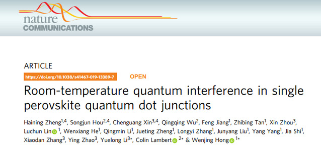 近日,我校化学化工学院洪文晶教授课题组与英国Lancaster大学Colin Lambert教授、南开大学李跃龙副教授团队密切合作,在钙钛矿量子点量子干涉效应研究方面取得重要进展。相关研究成果以“Room-Temperature Quantum Interference in Perovskite Quantum Dot Junctions.”为题发表于Nature Communications上(DOI:10.1038/s41467-019-13389-7)。