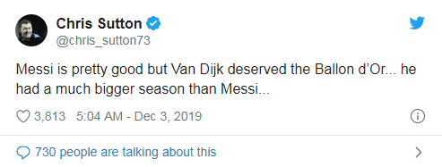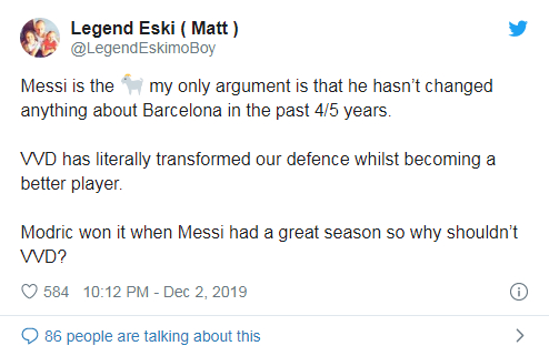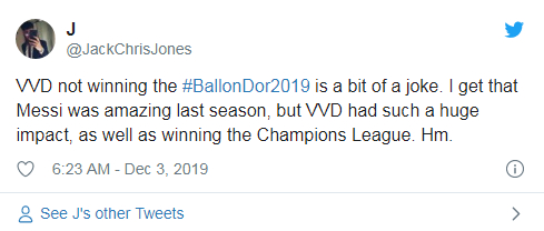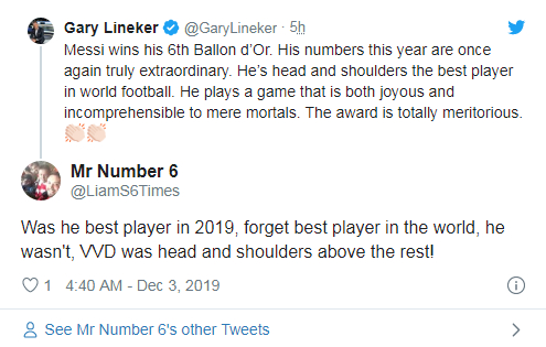 那些认为梅西“当之有愧”的声音则专注攻击“梅西在世界杯上什么都没做”这一点,还有网友直言“利物浦打败了巴萨,还记得吗”,这也成为不少网友认为范戴克更有资格获得这一奖项的理由。有评论称“金球奖颁给梅西不过是为了使其在职业生涯末期的糟糕状态中振作起来”。