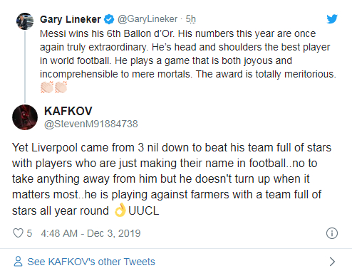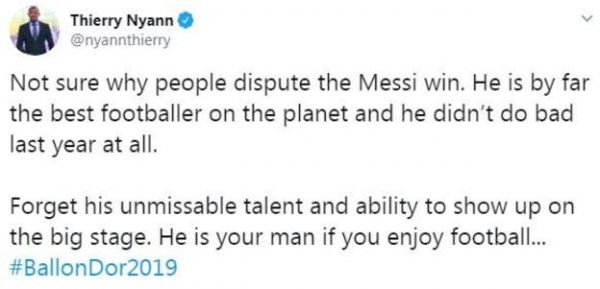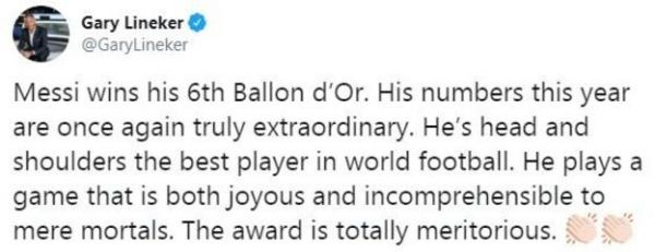 不过也有些人认为梅西并非实至名归,知名体育记者蒂埃里·尼扬在自己的社交账号上反驳了这些声音。英格兰退役球员、现体育节目主持人加里·莱因克尔则重申了梅西是“世界足球最好的球员”的观点。有评论称,足球说的就是梅西的语言。