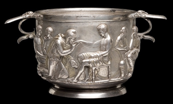 公元1世纪的罗马银杯(Roman silver cup),这是银杯从一名丹麦酋长的墓穴中挖掘出土,杯身雕刻着特洛伊王普里阿姆(Priam)亲吻阿喀琉斯(Achilles)手背的场景