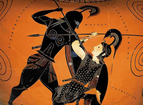 阿喀琉斯,最勇敢的英雄,可能出现在战场上。但他还被描绘为将赫克托的尸体拖到战车后面,然后将一名特洛伊木马少年的喉咙切开,进行了精神上的复仇。妇女和儿童在花瓶,大理石雕刻前排成一排,被宰杀。20世纪,在赛·托姆布雷(Cy Twombly)的绘画中,颤抖的鲜血面纱形成了字母A:阿喀琉斯和他致命的长矛尖头。