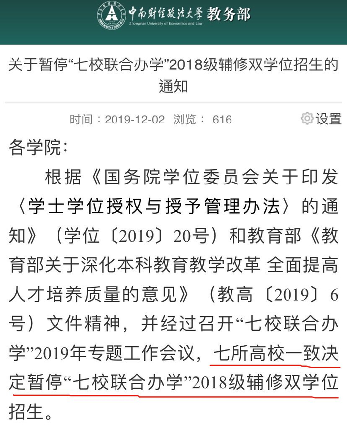 据长江日报-长江网报道,记者从华中科技大学、华中农业大学、中国地质大学教务处证实, “七校联盟”今年招生工作已停止,2016级、2017级已报名学生可继续完成剩余课程,并拿到双学位证书。各校可对本校学生继续进行辅修学士学位招生。