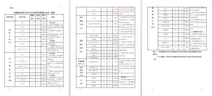 据官方公布的《七校联合办学2018-2019学年各校招生专业一览表》显示,2018-2019学年各校招生专业数量分别为:武汉大学(7)、华中科技大学(10)、华中师范大学(3)、武汉理工大学(8)、中国地质大学(1)、华中农业大学(3)、中南财经政法大学(14)。