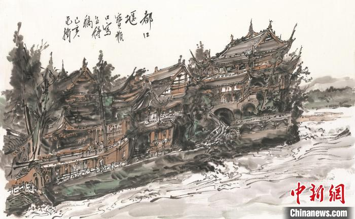 范扬 都江堰宝瓶口写生得稿 45cm×73cm 2019年纸本水墨设色。主办方供图