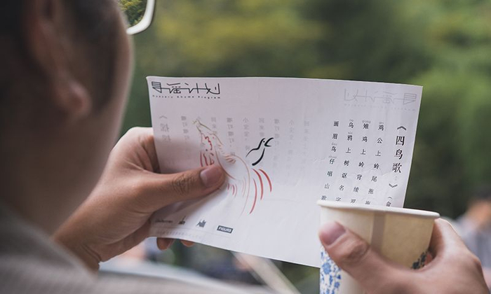 宇威是寻谣团队里的设计师,每次活动的歌词页和海报都出自他手。这一路上他听过几十位老人的故事,偶尔会主动跟遇到的老人聊天,有时甚至会花二三十分钟的时间跟老人求证,歌词里说的究竟是白乌鸦还是白喜鹊。这是他对童谣的还原和记录的方式。