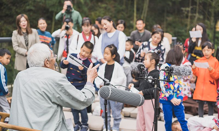 一个穿着灰色马甲的小朋友喊得格外卖力,几乎整个人都挂到了亭台边的栏杆上:「爷爷!我是说话最多和唱歌声最大的那个人!」