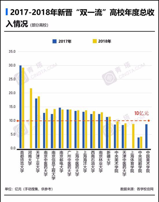 2017-2018年,新晋“双一流”高校的年度总收入,有12所高校都在10亿元以上。