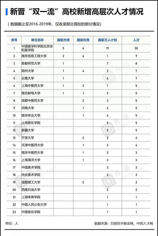 2016-2019年,新晋“双一流”高校入选较多国家杰青、优青和万人计划,其中中国医学科学院北京协和医学院共有30人,居第一;中国科学院大学有14人,位第二。