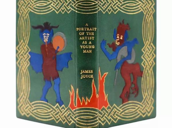 伦敦:Jonathan Cape Ltd.,1928年六刷(此著初版由伦敦自我主义者出版社于1916年推出)此册是乔伊斯题赠本。书框中以彩色镶皮呈现源于中古爱尔兰的手抄本首字母,以此彩饰的魔鬼与地狱之火的图案是冲动的象征。