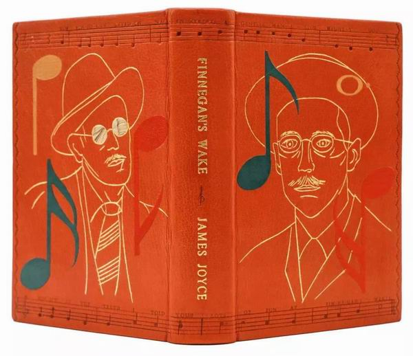 伦敦:Faber & Faber Ltd.,纽约:The Viking Press,1939年;初版一刷;乔伊斯签名425册,此册编号2,曾为纽约书画藏家Ward Cheney入藏。封面封底以无色印压苏格兰民谣“芬尼根的守灵夜”五线乐谱为边框上下两栏,并以线条勾勒乔伊斯半身像,叠加彩色音符。