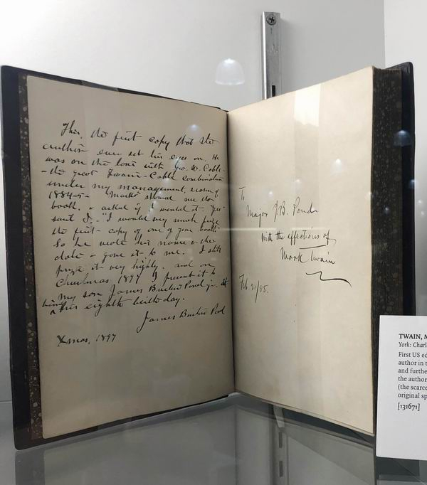 马克·吐温签赠给友人的《哈克贝利·费恩历险记》1885年初版本。签赠时间是出版当月,那位友人又在旁边写了一段题跋说:“这是作者拿到手的第一本书。”半摩洛哥皮面装帧,初版本有三种不同的装帧,这是最少见的一种。十九万五千美元。