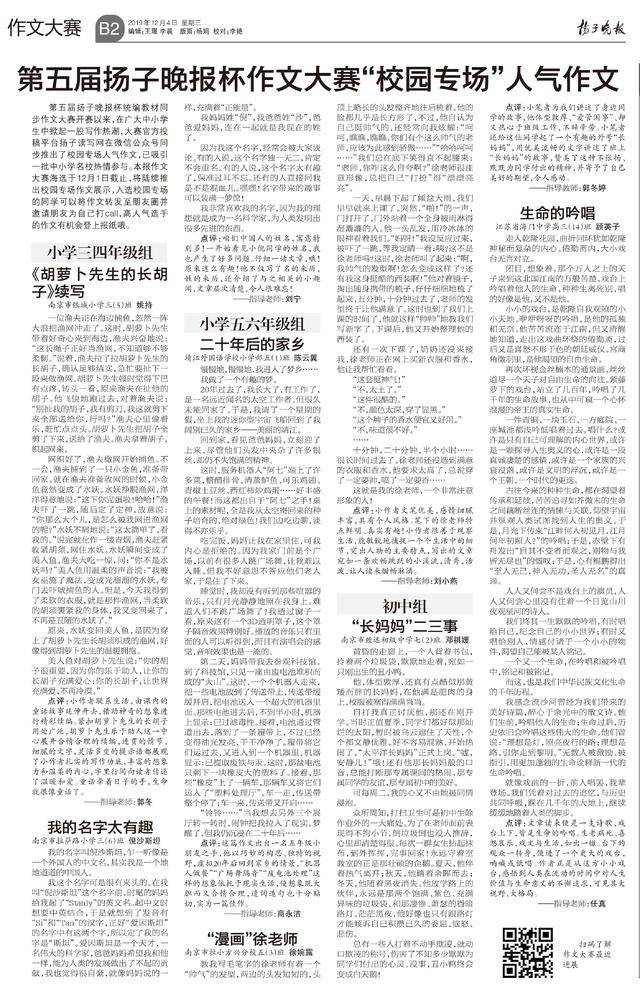 扬子晚报12月4日讯(记者 王雪瑞)第五届扬子晚报杯统编教材同步作文大赛开赛以来,在广大中小学生中掀起一股写作热潮,大赛官方投稿平台扬子读写网在微信公众号同步推出了校园专场人气作文,已吸引一批中小学名校热情参与。本报作文大赛海选于12月1日截止,目前校园专场作文展示仍在进行中,入选校园专场的同学可以将作文转发至朋友圈并邀请朋友为自己打call,高人气选手的作文有机会登上报纸哦。