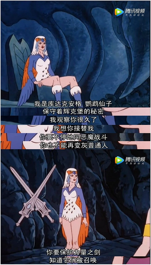 灰壳堡的鹦鹉仙子(Sorceress)是一个非常美丽的女人,是守卫灰壳堡的女巫,能够化身为一只隼(falcon)。Sorceress直译就是女巫。广西电视台误认她的化身是鹦鹉,取了一个中国化的美丽名字“鹦鹉仙子”。鹦鹉仙子本名蒂拉娜(Teela Na),这个名字是不是和女主角蒂拉(Teela)很像?没错,她就是蒂拉的母亲。蒂拉娜本是普通的人类,年轻时继承老鹦鹉仙子库杜克·昂戈尔(Kuduk Ungol)的位置,成为这任鹦鹉仙子。从此,蒂拉娜住在灰壳堡,并保护那里的秘密和智慧,还承担着将力量之剑传到有缘人手中。她能与几个最信任的知己进行心灵感应式的交流,她与希曼是亦师亦友的关系。不过,她的巫术虽然强大,只要一出灰壳堡就会衰弱甚至失灵。