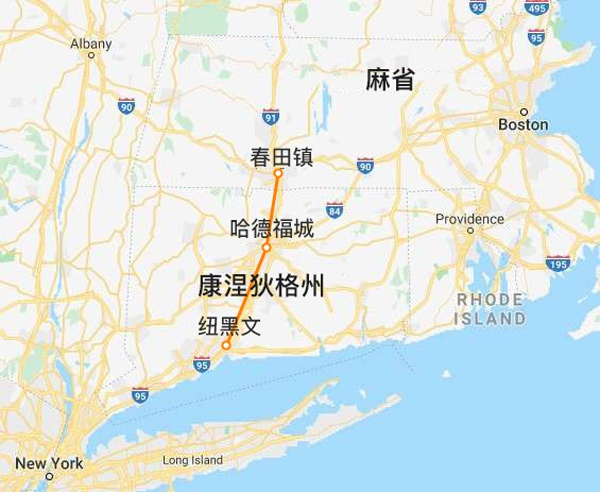 康涅狄格州(Connecticut)的纽黑文(New Haven)、哈德福城(Hartford)和麻省(Massachusetts)的春田镇(Springfield),三点一线。 谷歌地图截图