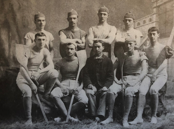 1881年耶鲁赛艇队合影,前排中间的系舵长(coxswain)钟文耀(Chung Mun Yew),钟文耀属于第一批留美幼童,广东香山县人氏。耶鲁大学图书馆藏,照片编号3237。公有领域版权。