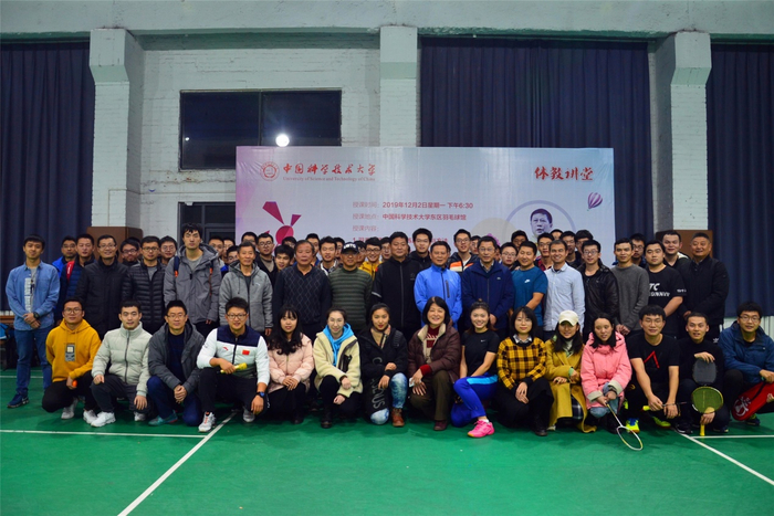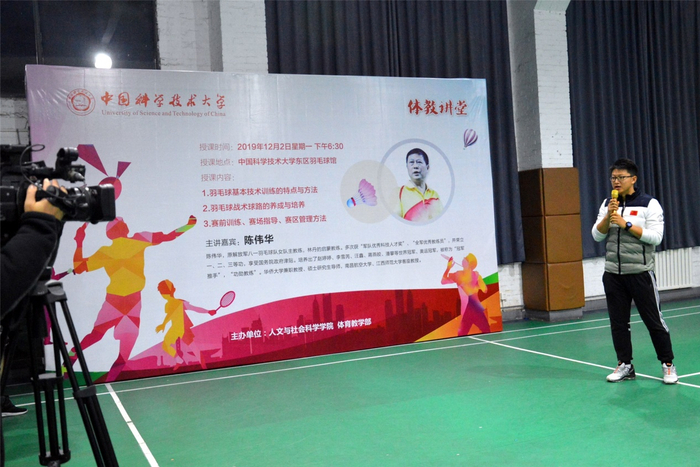 12月2日晚上6点半,科大东区羽毛球馆座无虚席。由教务处人文社科基础教学中心主办,人文与社会科学学院体育教学部承办,学生羽毛球协会、教职工羽毛球协会协办的体教讲堂之功勋教练陈伟华羽毛球讲座在我校成功举办。参会嘉宾有中国科学技术大学校长助理、教务长、教职工羽毛球协会会长周丛照,人文与社会科学学院体育教学部主任兼工会副主席曾文,体育教学部党支部书记王永,羽毛球俱乐部教师李忠广以及相关羽毛球课程组成员等。讲座由体育教学部教师、教职工羽毛球协会副秘书长杨旭东主持。