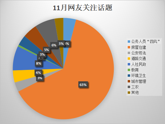 11月1日至11月30日的网友诉求中,因全省已进入供暖时间,供暖问题成为网友关注的热点问题,房屋住建问题网友投诉占比为63%;人社民政问题占比8%;三农问题占比较10月份有所上升,11月占比6%。