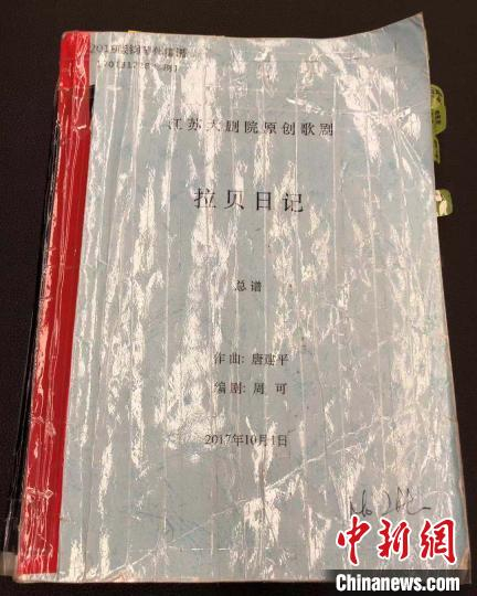 这本蓝色封皮的大书已经被翻烂。透明胶布把封面拼凑包裹了起来。大书洋洋洒洒万余字,讲述了德国商人约翰·拉贝在南京大屠杀中如何救助25万中国难民的故事。歌剧从创作到定型,历经3年,如今已在欧洲巡演。