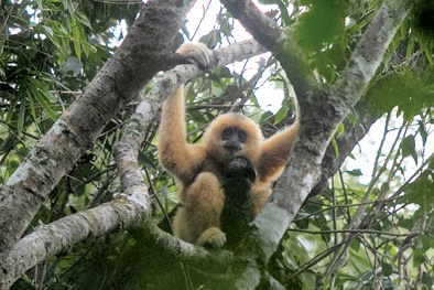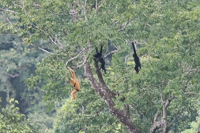 在距调查队员头顶约20米高的树冠层,一群同一家族的长臂猿正觅食。成年雄猿、雌猿分别呈黑色和金色,幼崽则面朝母体四肢紧扣在母猿腹前,随母猿移动而移动。凭借矫健的四肢尤其是一双长臂,它们在密林上空自由攀爬、荡跃。它们跳到哪里,哪里的树林就哗哗作响。