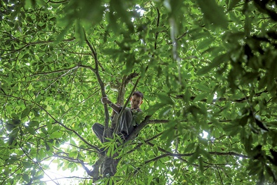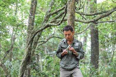 10月25日调查海南长臂猿期间,李文永爬上一棵大树,准备获取红外相机数据并重新安放红外相机。