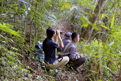 调查队员拿出照相机、望远镜拍摄和观测长臂猿,用纸笔记下长臂猿鸣叫的起止时间、方位、距离、鸣叫种类、个体数量、监听点坐标等数据。