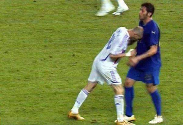 齐达内因为受到马特拉齐言语刺激,用头直接顶向对手的胸膛。