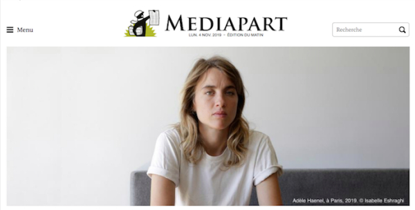 11月4日法国媒体Mediapart网站首页头版哈内尔幼年被性侵报道截图。
