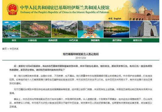 据中国驻巴基斯坦使馆网站12月4日消息,有记者提问:美联社报道称,有629名巴基斯坦籍新娘被卖到中国,其中可能存在虐待、组织卖淫、器官买卖等行为。有关行为一直没有得到有效遏制,甚至还在增加。请问驻巴使馆对此有何评论?