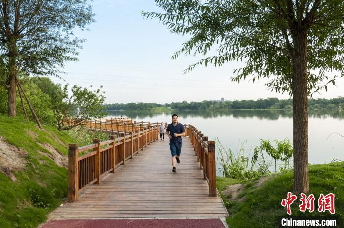 人们在鲁家滩湿地公园锻炼。 钟欣 摄