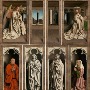 《根特祭坛画》位于比利时根特圣巴蒙教堂的祭坛,是现存最早的带有签名的尼德兰绘画作品,是一种多翼式“开闭形”的祭坛组画,外面9幅。闭合的祭坛内12幅。只有在节日的礼拜盛会时,祭坛的两翼才有可能打开,人们才得以见到内层的12幅杰作。
