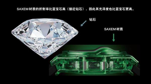 这种SAXEM材质全称是蓝宝石氧化铝及稀土矿物(Sapphire Aluminium oXide and rare Earth Mineral)。为了呈现独特的绿色色调、透明度以及光泽度,宇舶制表厂将铥、钬和铬等稀土元素与蓝宝石基础成分氧化铝混合。所得材质比柔软且难以打磨的翡翠更加坚硬,而且比蓝宝石更有光泽度。另外,SAXEM材质还具有其他优势,例如材质的坚硬度略微下降,加强了打磨过程的稳定性,而立方晶体结构则让表壳从任意角度观赏都呈现相同色彩和饱和度。