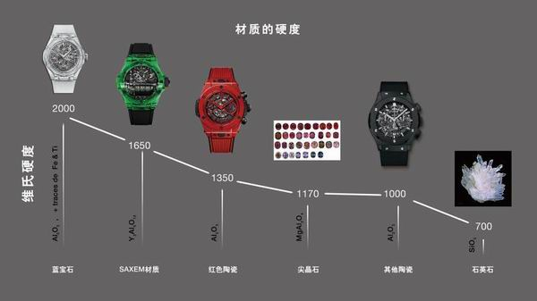 以维氏硬度来标记,全新材质比起蓝宝石水晶的2000硬度更降低了一些,达到1650,但仍然比极其耐磨的高科技陶瓷1000-1350更强。