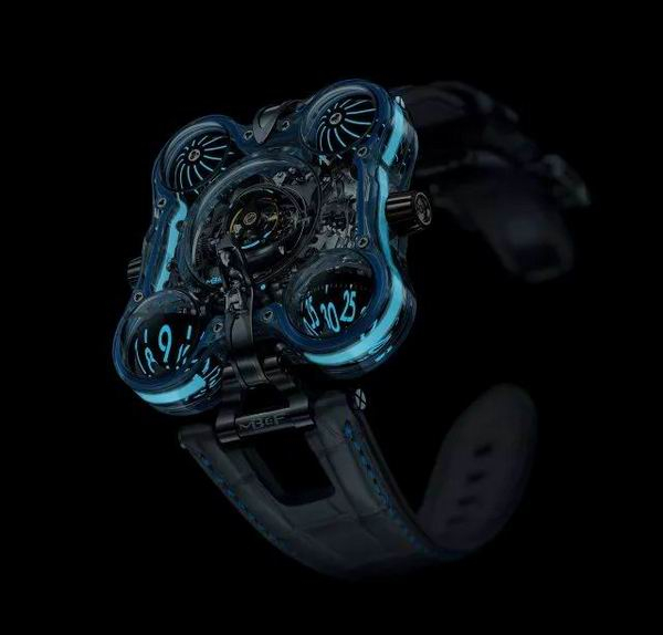 配备蓝色夜光的MB&F HM6 蓝宝石版腕表,极具科幻色彩。