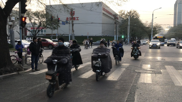 前天晚6点多正是晚高峰,工人体院场东路与北路交叉的十字路口,人流攒动,四面八方的车流也汇聚在一起。其中,最显眼的就是一辆辆披着“棉护甲”的电动车了。