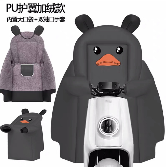 仔细观察,这些棉护甲主要有两类,一类是像门帘子似的从车把一直搭到脚踏板,另一类则穿在骑手身上,前长后短从脖子一直“武装”到脚踝。
