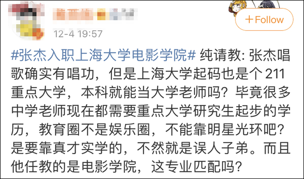 但也有网友提出质疑:张杰本科学历,是否有资格担任高校教师,且歌手为什么要去电影学院教书?