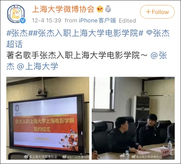12月4日,上海大学微博协会官方微博发文宣布歌手张杰入职上海大学电影学院,并晒出签约仪式的现场照片。