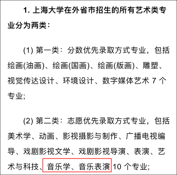 观察者网查询了上海大学上海电影学院2019年招生简章(外省市)发现,其专业设置中的确有音乐学、音乐表演专业。