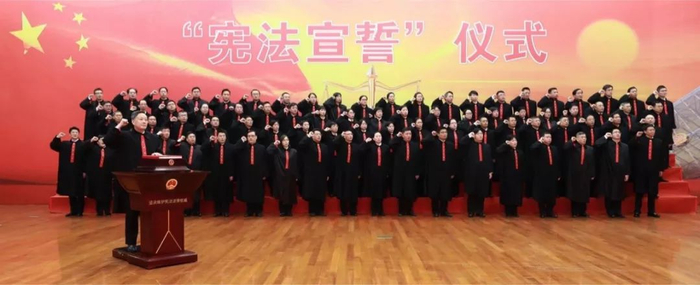 刘晓云向现场参加宣誓仪式的法官颁发《上海市人民代表大会常务委员会任命书》。之后,由刘晓云大法官领誓,全体法官右手握拳,面向国旗庄严宣誓。