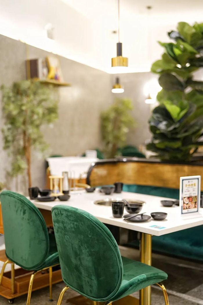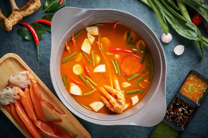 现砍的椰青水做锅底,浓郁的色泽是因为加入了香茅、南姜、椰浆、柠檬叶……10多种料调味。鲜甜的椰青水让泰式口味变得更为柔和,既能清甜提味但又不抢味~