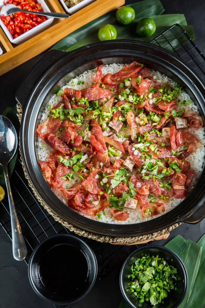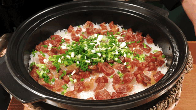 腊味饭是现点现煲的,要耐心等20分钟左右,上桌后会有店员帮搅拌均匀,颗粒分明的米饭拌上葱花酱油,底下的锅巴决不能放过,太香了!