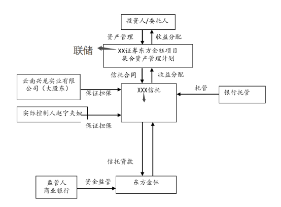 记者在产品推介书中看到,联储证券方面承诺,其在产品发行后“有一套完整和成熟的风控体系”,成立专项小组负责本项目后续监督和管理,严格执行公司内部相关管理办法。监管体系包括对东方金钰、对保证担保人云南兴龙及赵宁夫妇监管。