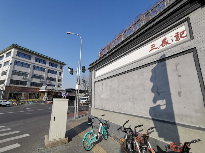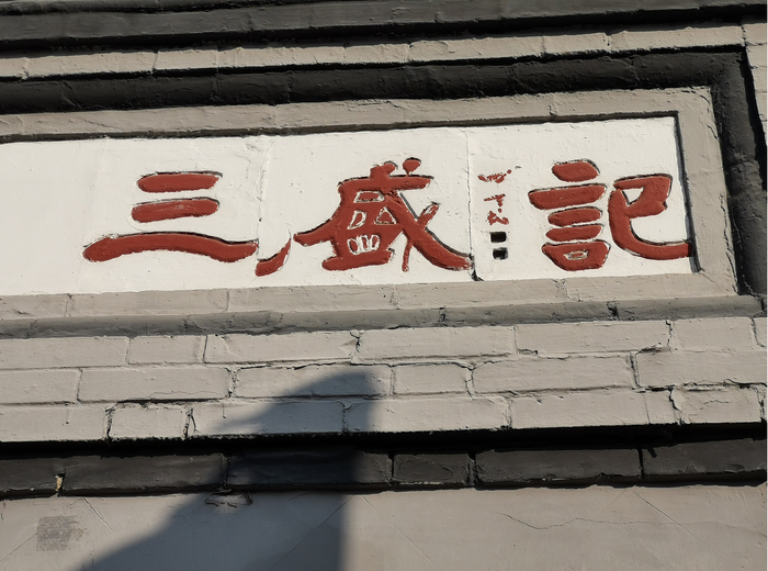 今天中午,记者来到北新华街和西交民巷西口交汇处,路口东北角是转角的高墙,足有四五米高,墙体最上一层,白底红字、从右往左,有“记盛三”三个字的砖雕牌匾。