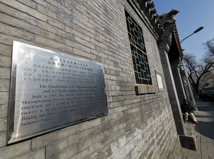 记者绕到西交民巷一侧沿着墙往里走,看到一处大宅门,发现这处带砖牌匾的高墙属于市级文保院落西交民巷87号、北新华街112号,根据镶嵌在墙上的介绍,这两个院落合在一起,在1984年5月24日被公布为市级文保院落。