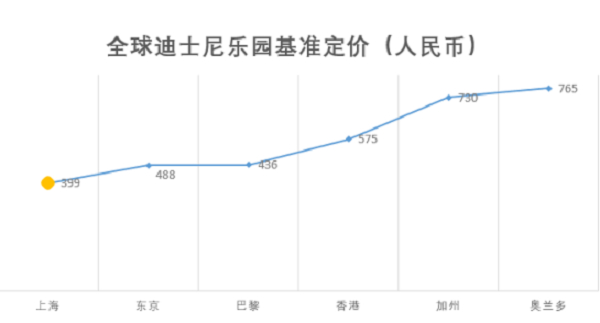 由于上海迪士尼此次将基础门票价格保持不变,仍为399元,因此与其他迪士尼家庭成员相比,继续占据价格优势。其次为巴黎迪士尼乐园56欧元(约合人民币436元)、东京迪士尼乐园7500日元(约合人民币488元)、香港迪士尼乐园639港币(约合人民币575元)、加州迪士尼乐园104美金(约合人民币730元),以及奥兰多华特迪士尼世界109美金(约合人民币765元)。