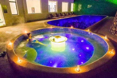 酒店温泉区共有50余个温泉泡池,氡温泉水引进于地底下1500米深的泉水,水温47°,属重碳酸钙型热矿泉,泉水富含氡、镭、钡、锶等多种矿物质元素。每个池子具有私密性,另外还有8处“木屋温泉”是较为开放式的温泉池。