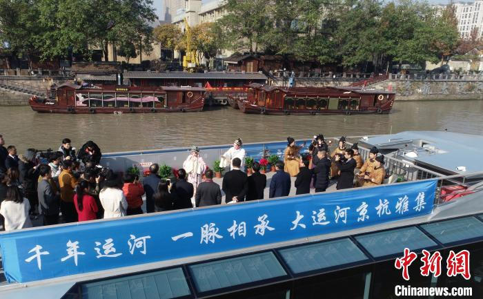 码头旁,一艘客船挑起明灯静泊,阵阵越剧咿呀同诗歌朗诵之声划破河面,浅唱低吟间,千年前的文人雅集今日重现京杭大运河上。