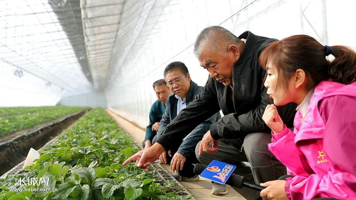 尚义县草莓种苗繁育基地负责人李伟斌向记者讲述草莓苗繁育过程中遇到的问题。长城新媒体记者 马宁 摄